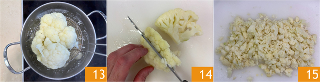 Mientras tanto, la coliflor estará lista, así que escúrrela 13 y pícala groseramente 14 15.