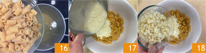 Cocina la pasta en el caldo en el que cociste la coliflor 16. Escurre la pasta al dente, luego añade la bechamel 17 y la coliflor 18.