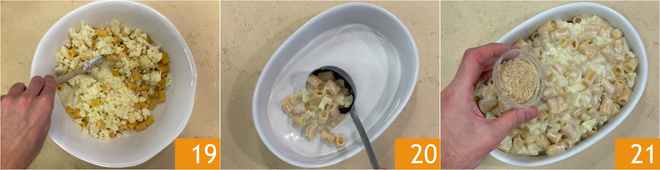 Mezcla bien para integrar todo 19. Transfiere la pasta así condimentada a una fuente para horno 20, luego espolvorea la superficie con las escamas de levadura nutricional 21 y un hilo de aceite.