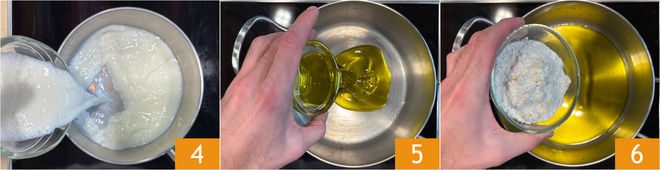 Mientras tanto, prepara la Bechamel sin mantequilla: vierte la leche de avena en un cazo 4 y llévala casi a ebullición. En otro cazo, junta el aceite 5 y la harina 6.