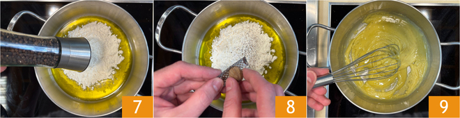 Sazona con sal, pimienta 77 y nuez moscada 8, luego mezcla con una varilla a fuego medio durante unos 3 minutos 9.