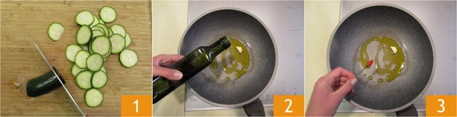 Para preparar la pasta al horno con crema de calabacines, primero lave, quite los extremos y corte en rodajas de aproximadamente 1/2 cm los calabacines 1. Vierta en la sartén un chorrito de aceite de oliva virgen extra, agregue el ajo 2 y el chile triturado 3 pero sin cortar. Deje sofreír durante 2-3 minutos.