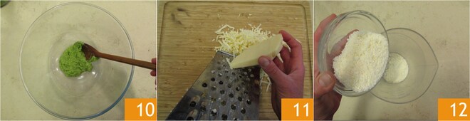 Vierta la crema obtenida en un bol grande 10. Ralle el Edamer 11 con un rallador de agujeros grandes y reserve. En otro vaso alto, vierta el Parmesano Reggiano DOP rallado fino 12.