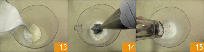Agregue la nata fresca líquida 13 y triture con la batidora de inmersión 14 para obtener una crema. Luego, pimienta al gusto y reserve 15.