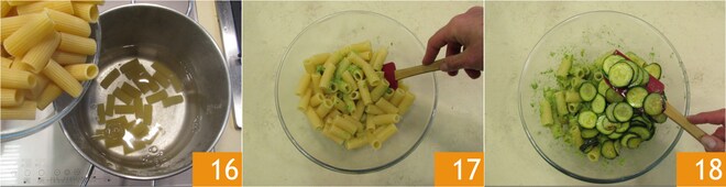 Hierva la pasta en agua hirviendo con sal al gusto 16 y escurra al dente 16. Escurra la pasta en el bol con la crema de calabacines 17 y agregue también los calabacines restantes 18.