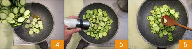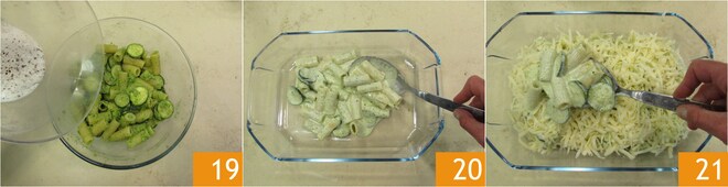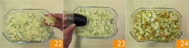 Termine con el Edamer rallado restante 22, calabacines en rodajas y una pizca de pimienta 23. Cocine en horno estático a 210° durante 5 minutos, luego otros 5 minutos bajo el grill. Saque del horno y aromatice con hierbas frescas 24.