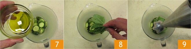 Tome la mitad de los calabacines, transfiera a un vaso alto con 20 g de aceite de oliva virgen extra 7 y algunas hojas de menta al gusto 8. Triture con la batidora de inmersión 9 obteniendo una crema.