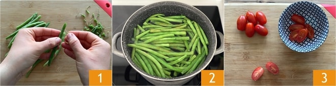 Para preparar la pasta al pesto de judías verdes, tomatitos y aceitunas, primero lleva a ebullición una olla de agua con sal y limpia las judías verdes eliminando los extremos y el filamento 1. Cocina las judías verdes en el agua hirviendo durante 15-20 minutos 2. Mientras tanto, lava los tomatitos y divídelos por la mitad 3. Pon al fuego otra olla con agua para hervir la pasta.