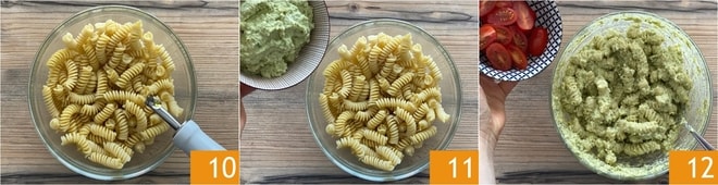 Escurre la pasta al dente y condiméntala con un hilo de aceite 10, luego agrega el pesto de judías verdes 11 y los tomatitos 12.