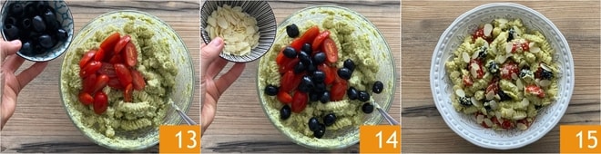 Añade también las aceitunas 13 y las almendras en láminas 14. Vierte otro hilo de aceite y mezcla bien. ¡Tu pasta al pesto de judías verdes, tomatitos y aceitunas está lista para ser servida 15!