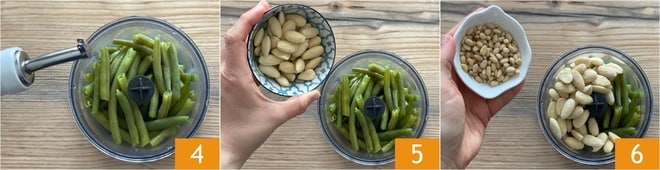 Cuando las judías verdes estén cocidas, escúrrelas y pon a cocinar la pasta. Transfiere las judías verdes a un mezclador con cuchillas de acero y agrega la mitad del aceite 4, las almendras enteras 5 y los piñones 6.