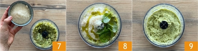Tritura de forma intermitente durante unos segundos, luego añade también el Parmesano rallado 7, la albahaca y el aceite restante, o el necesario para obtener la consistencia adecuada 8. Tritura de nuevo hasta obtener una salsa cremosa 9.
