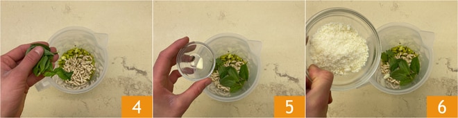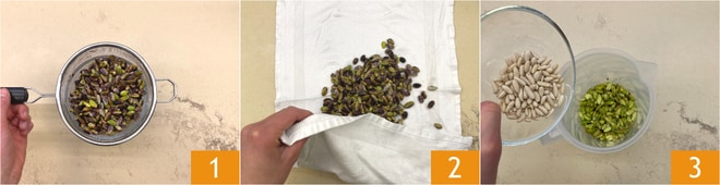 Para preparar la pasta al pesto de pistachos, primero rehidratad los pistachos en agua durante 2 horas (como alternativa, se pueden hervir durante un par de minutos). Luego escurridlos 1 y colocadlos sobre un paño seco, frotadlos para eliminar la piel 2. Colocad los pistachos pelados en un vaso, añadid los piñones 3.