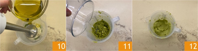 Ahora comenzad a batir con la batidora de inmersión vertiendo el aceite poco a poco 10, añadid también un poco de agua caliente, la suficiente para obtener una consistencia cremosa 11. El pesto de pistachos está listo 12.