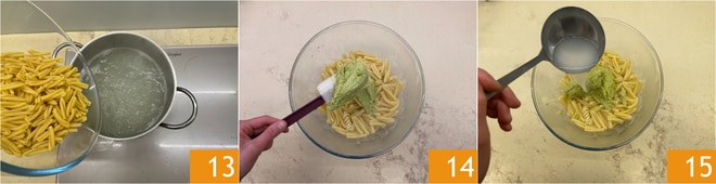 Coced la pasta en agua hirviendo con sal durante el tiempo indicado en el paquete 13. Una vez cocida, escurridla en un bol y añadid el pesto de pistachos 14. Verted un cucharón del agua de cocción 15.