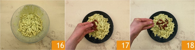 Mezclad para amalgamar 16. Servid la pasta al pesto de pistachos bien caliente con los tomates en aceite cortados en tiras 17 y la granella de pistachos 18.