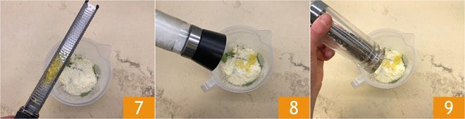 Rallad la cáscara de medio limón 7, salpimentad 8 y 9.