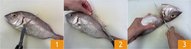 Para preparar la pasta al ragú blanco de pescado, empezad limpiando y fileteando el pargo: primero haced una incisión en el vientre para destriparlo. Luego cortad las aletas 1 2 y separad la cabeza 3.