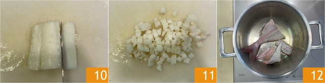 Cortad el bacalao del mismo tamaño 10 11. Poned las espinas y los restos del pargo en una olla 12.