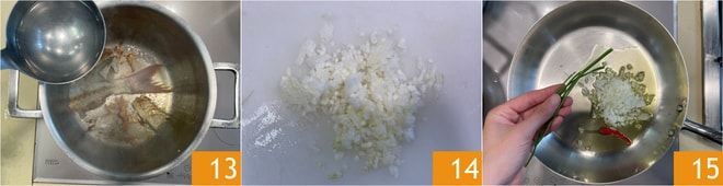 Tostad bien los restos, luego añadid 2 cucharones de agua, sal y llevad a ebullición 13. Limpiad y picad la cebolla 14. En una sartén verted el aceite, la cebolla, las ramas de perejil y la guindilla 15. Dejad que la cebolla se dore.
