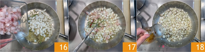Incorporad los daditos de pescado 16 y dejad dorar unos minutos, luego eliminad la guindilla y las ramas de perejil 17. Verted el brandy 18.