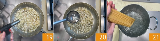 Flambead con un soplete 19 o con los fuegos del fogón. Añadid sal y un cucharón de agua 20, cocinad otros 2 minutos. Coced los espaguetis gruesos 21.