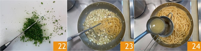 Mientras se cocina la pasta picad las hojas de perejil, el tomillo y la mejorana 22. Escurrid los espaguetis dejándolos al dente y vertedlos en la cazuela con el pescado 23. Añadid el caldo de pescado colado 24 y si es necesario agua de cocción.