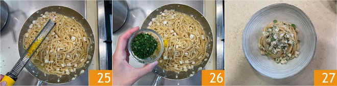 Terminad la pasta con el fuego apagado mezclando con aceite, ralladura de limón 25, picado de hierbas 26 y pimienta. Emplated la pasta al ragú blanco de pescado y decorad con mejorana fresca 27.