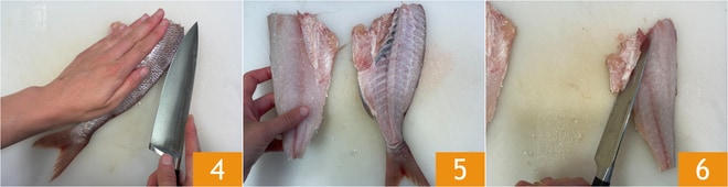 Cortad el pescado por la mitad 4 para obtener los filetes 5, eliminad también la parte del vientre 6. No tiréis los desperdicios de la limpieza porque servirán después para hacer un caldo de pescado.