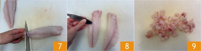 Una vez obtenidos los dos filetes, quitad la piel pasando la hoja del cuchillo desde la cola manteniendo la piel tensa 7. Ahora eliminad las espinas con la pinza especial 8. Cortad el pargo en cubos de aproximadamente 2 cm 9.