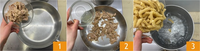Para preparar la pasta con atún en blanco, como primer paso pon el atún bien escurrido en una sartén 1, caliéntalo por unos minutos, a fuego lento, y añade el jugo de limón 2. Cuece la pasta en abundante agua hirviendo con sal 3.