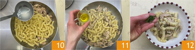 Si el condimento no está lo suficientemente cremoso añade un cucharón de agua de cocción de la pasta 10 y mezcla. Apaga el fuego, añade el aceite 11 y mezcla bien. Sirve y completa con perejil picado 12.