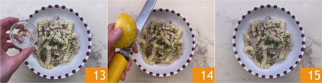 Completa con un poco de chile seco 13 y la ralladura de limón 14. Tu pasta con atún en blanco está lista para ser degustada 15.