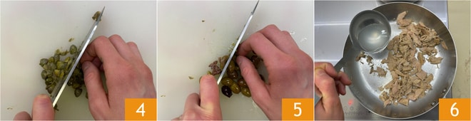 Mientras tanto, pica finamente las alcaparras 4 y las aceitunas 5. Añade un cucharón de agua de cocción de la pasta en la sartén 6.