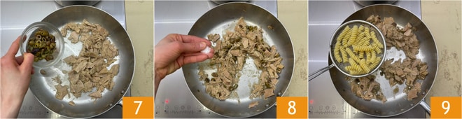 Incorpora las alcaparras y las aceitunas 7, ajusta de sal 8 y mezcla para amalgamar los ingredientes. Escurre la pasta directamente en la sartén 9.