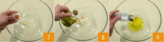 En un bol grande verted el ajo y la guindilla picados 7, abundante aceite de oliva 8 y sal al gusto.