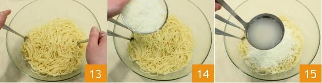 Mezclad rápidamente los espaguetis 13 y añadid el pecorino rallado 14 y un cucharón de agua de cocción 15.