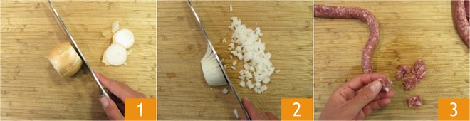 Para preparar la pasta alla norcina limpia 1 y pica finamente la cebolla 2. Haz un corte ligero en la salchicha, elimina la tripa y desmenuza groseramente con las manos 3.