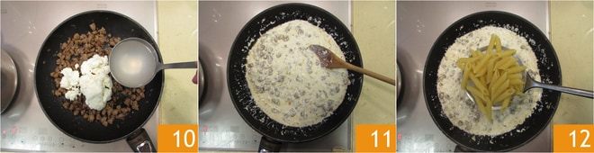 Añade un cucharón de agua de cocción de la pasta 10 y mezcla 11. Escurre la pasta al dente directamente en la sartén con el condimento 12 y saltea a fuego alto durante 2 minutos.
