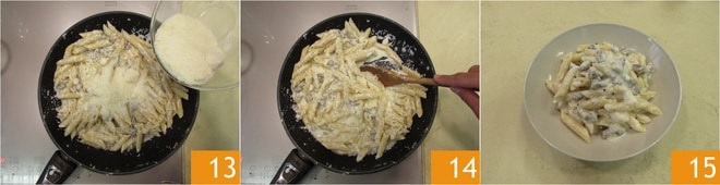 Termina la preparación con la adición del Parmigiano 13, mezcla bien 14 y sirve bien caliente la pasta alla norcina 15.