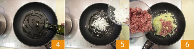 Vierte un poco de aceite en una sartén 4, añade la cebolla picada 5, el diente de ajo y deja sofreír a fuego medio durante unos 5 minutos. Añade la salchicha desmenuzada a la cebolla 6 y cocina a fuego moderado durante otros 5 minutos, hasta que esté bien dorada. Mientras tanto, pon al fuego una olla llena de agua y sala al hervirla, servirá para cocinar la pasta.