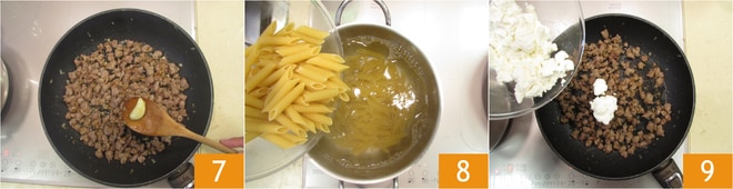 Elimina el ajo y apaga el fuego 7. Cocina la pasta al dente 8. Vierte la ricotta de oveja en la sartén 9.