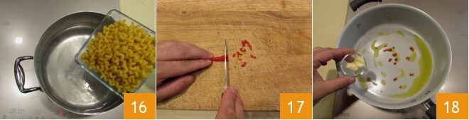 Coced la pasta en abundante agua hirviendo, ligeramente salada (ya que el condimento será muy sabroso, gracias a la presencia de la ricotta salada) 16. Mientras tanto, cortad un pimiento fresco, eliminad las semillas y picadlo finamente 17. Colocad en una cacerola el aceite junto con el ajo, sin el germen, y el chile 18 y dejadlos dorar a fuego moderado, luego eliminad el ajo.