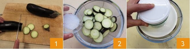 Para preparar la pasta alla Norma en blanco, comenzad con la limpieza de las berenjenas. Lavad las berenjenas, quitad los extremos y cortadlas en rodajas de medio cm de grosor 1. Colocadlas en un colador espolvoreándolas poco a poco con sal gruesa 2. Cubrid con un plato y colocad un peso encima 3 y dejad las berenjenas reposar durante 1-2 horas. De este modo eliminarán el exceso de líquido y el regusto amargo.