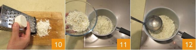 Dedicaos ahora a la preparación de la crema de ricotta salada. Rallad la ricotta salada 10 y reservad unos 50 g para la decoración final; verted el resto en una cacerola 11. Añadid un cucharón de agua caliente 12,