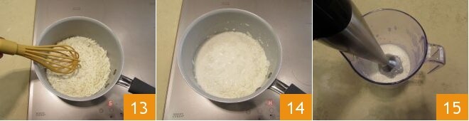 mezclad con una batidora 13 y cocinad durante unos 10 minutos, hasta que la ricotta se haya derretido 14. Luego verted la crema de ricotta salada en un recipiente de bordes altos y batidla con una batidora de inmersión 15, hasta obtener una salsa lisa y homogénea.