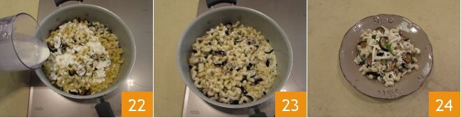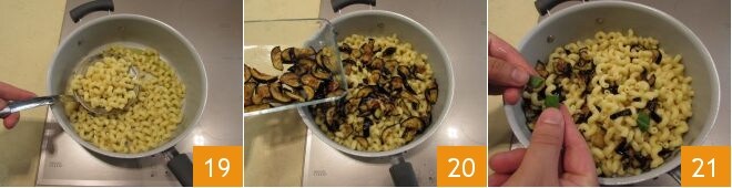Escurrid la pasta al dente y añadidla en la cacerola con el aceite y el chile 19, agregad también las tiras de berenjenas 20 y las hojas de albahaca troceadas a mano 21.