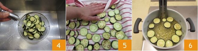 Pasado este tiempo, enjuagadlas bajo abundante agua corriente 4 y secadlas con un paño de cocina limpio y seco 5. Colocad el aceite de semillas en una cacerola de bordes altos y llevadlo a la temperatura de 170° (utilizad un termómetro de cocina para alcanzar la temperatura correcta) y echad dentro pocas rodajas de berenjenas a la vez 6, para no bajar la temperatura del aceite.