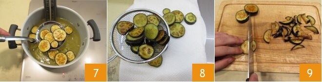 Freíd las berenjenas hasta que estén bien doradas, luego escurridlas con una espumadera 7 y colocadlas en una bandeja forrada con papel absorbente 8. Una vez eliminado el exceso de aceite, cortad las berenjenas fritas en tiras 9 y reservadlas.