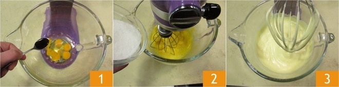 Para preparar la pasta biscuit, verted en el bol de la batidora con varillas los huevos y el extracto de vainilla 1. Poned en marcha la máquina y lentamente añadid también el azúcar. Batid durante aproximadamente 10 minutos hasta obtener una mezcla esponjosa, clara y espumosa 3.